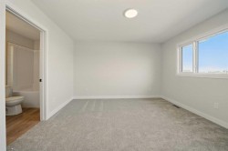 Quality built by Valley Mountain Homes, these brand new duplexes are located on a close. Excellent floor plan with 1205 sq ft on 2 levels and an attached single garage. The main floor has 9' ceilings with an open style floor plan. The kitchen has flat panel melamine cabinets, full tile backsplash, quartz countertops and comes with the fridge, stove, dishwasher and hood fan. The eating area and living room have nice sized windows. There is a garden door out to the deck that has aluminum railings, there is a vinyl fence with a 6' high dividing fence between the units. There is a 2 pce bath on the main floor. Upstairs has 3 bedrooms, the primary is quite large and it has a 4 pce ensuite & walk in closet. The other 2 bedrooms share a 4 pce bath and there is upper floor laundry for your convenience. The WALKOUT basement is undeveloped. The furnace and hot water tank are high efficient.