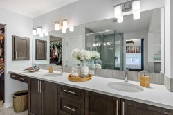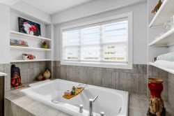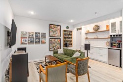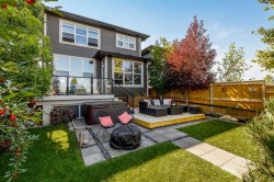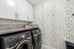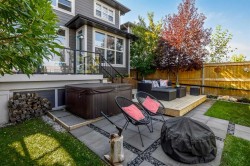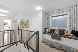 **Open House Saturday January 17th 1-3PM** From the moment you step inside, this stunning home feels like something out of a Pinterest board or a high-end interior design magazine. Every detail has been thoughtfully selected & expertly executed, making it a true showstopper that shows 10 out of 10. Located in the prestigious community of Riverstone in Cranston, this 2,500 sq ft two-storey home offers an unbeatable lifestyle—BACKING DIRECTLY onto a tranquil NATURAL RESERVE & fronting onto a kid-friendly playground. It’s the ideal combination of luxury, functionality, & location. Inside, you’re greeted by 10' ceilings, acacia hardwood floors, & a layout that flows effortlessly. The front dining room features a double tray ceiling & a striking designer light fixture, while the expansive rear living room is anchored by a gas fireplace wrapped in marble-style tile with a lower hearth. Large windows along the back wall frame serene views of the green space beyond, bringing the outdoors in. The chef’s kitchen is a showpiece—featuring full-height dark-stained cabinetry with bar pulls, white quartz counters, upgraded appliances, & a stunning herringbone tile backsplash that extends to the ceiling around the hood fan. A cabinet-style pantry wraps into a coffee bar nook for added function & flair. The back mudroom connects seamlessly to the oversized garage & includes locker-style built-ins. A beautifully wallpapered 2-piece powder room adds a touch of charm. Upstairs, the large bonus room is wrapped in modern railing & showcases a birch forest wallpaper feature wall, built-in ceiling speakers, & laminate floors that continue throughout the upper level (carpet only on the stairs). A convenient built-in desk area outside the kids’ bedrooms creates a perfect zone for homework or study sessions, while a built-in bench at the top of the stairs offers a cozy reading nook. All three bedrooms include custom California Closet-style built-ins for thoughtful storage. The primary suite overlooks the peaceful reserve & features a spa-like ensuite with a large soaker tub framed by a picture window, a massive glass shower, dual sinks with a dedicated vanity space, & a barn-style door leading to the generous walk-in closet. The professionally finished basement, completed by the builder, extends the living space with durable laminate floors, a spacious rec room, a bright fourth bedroom with a wallpaper feature wall, a 4-piece bathroom, & a sleek wet bar complete with sink & mini fridge—ideal for entertaining or relaxing movie nights. Step outside to discover your private oasis. The beautifully landscaped backyard is designed for both comfort & calm, with mature trees providing privacy & a two-tiered deck perfect for hosting or unwinding. A cozy hot tub area invites you to relax year-round, while thoughtful details like under-deck storage and low-maintenance landscaping enhance the functionality.