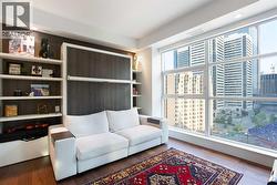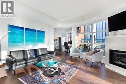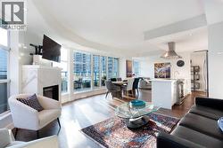 Welcome to your dream downtown retreat, just steps from the Bow River. This fully renovated sub-penthouse offers near 1,400 square feet of beautifully designed living space, featuring 2 bedrooms and 2 bathrooms, all tucked into one of Calgary’s most vibrant and walkable communities.As you enter, you're welcomed by luxury hardwood flooring that flows throughout the home, creating a seamless and contemporary feel. The open concept layout is bright, thanks to the floor-to-ceiling windows that flood the space with south facing light and offer stunning panoramic city views.The chef-inspired kitchen has been completely reimagined with sleek cabinetry, quartz countertops, an induction cooktop, and a modern hood fan. It’s perfect for everything from quick breakfasts to full dinner parties. The adjoining dining and living area is anchored by a beautiful fireplace, making it a cozy yet sophisticated space to entertain or relax.The first bedroom features floor-to-ceiling windows, a large walk-in closet, and a luxuriously renovated ensuite with dual vanities and a walk-in shower. A custom wall-mounted bed adds versatility, allowing the room to transform quickly. The second bedroom is equally flexible, offering floor-to-ceiling windows, a spacious walk-in closet, and easy access to the second fully renovated luxury bathroom, complete with high-end finishes and a stunning bathtub. You will also find a spacious laundry room with built-in, high-end cabinetry that provides extra storage and space.Step outside onto your expansive 300 square foot private terrace—whether you're sipping your morning coffee, hosting friends, this outdoor space is a true extension of your living area that comes with stunning downtown views.Additional features include in-suite laundry, central A/C, secure underground parking, remote controlled blinds, and a full-time concierge for added peace of mind.Situated just steps from the Bow River pathways, and some of Calgary’s top restaurants, cafés, this location offers the perfect blend of nature, and convenience. Whether you're walking your dog along the river or grabbing a latte with friends, everything you need is just outside your door. (id:27)