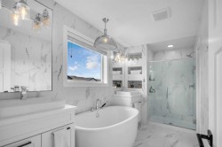 Nestled within the family-friendly enclave of Cornerstone and crafted by Truman Homes, this contemporary residence showcases bespoke finishes across its expanse, offering a total of six bedrooms and over 3,000 square feet of meticulously designed living space. The luminous main level boasts 9-foot ceilings and hardwood flooring, accentuating a spacious living area with a striking gas fireplace, a dining alcove, and an exquisite chef’s kitchen adorned with quartz countertops, an expansive island doubling as a breakfast bar, ample cabinetry, a walk-in pantry, and a comprehensive suite of appliances—an ideal setting for accommodating a large family. Upstairs, a bonus room provides additional flexibility, while the second floor hosts a laundry facility, four bedrooms, and a well-appointed 5-piece main bathroom. The master suite is a sanctuary unto itself, featuring hardwood flooring, a generous walk-in closet, and a spa-inspired 5-piece ensuite with marble floors, dual sinks, an indulgent oval soaker tub, and a separate shower stall. The lower level is thoughtfully finished to include two additional bedrooms, a 4-piece bathroom, a secondary laundry area, and a supplementary living space, ensuring ample room for relaxation and recreation. Completing this remarkable former show home is a practical mudroom situated off the garage, offering convenience and organization. Notably, this home is equipped with a side entrance, further enhancing its accessibility and versatility.
