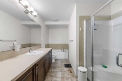 Welcome to the lifestyle you’ve been waiting for—where comfort, function, and community come together in perfect harmony. This beautifully maintained and thoughtfully upgraded home(2300+sqft) is nestled on a quiet, tree-lined street in the highly sought-after lake community of Mahogany. Surrounded by young families and just minutes from the wet lands, beach club, shopping, dining, schools, and parks, this is the kind of place where memories are made. From the moment you arrive, the curb appeal sets the tone—with a gorgeous landscape framing the front yard and a charming front elevation that welcomes you in. Step inside to discover a sunny, open-concept main floor with 9 feet ceilings designed for everyday living and easy entertaining. The front living room is bright and spacious, featuring oversized windows and a cozy electric fireplace framed by an exceptional media console—a perfect spot to gather and unwind. Centrally located, the dining room can comfortably fit a large table and sits beneath a modern light fixture, seamlessly connecting the living room to the heart of the home: the U-Shaped Gourmet kitchen. With dark brown cabinetry, white quartz countertops, a stylish mini brick subway backsplash, stainless steel appliances, and a sleek microwave hood fan, this kitchen checks all the boxes. LED lights and rich LVP floors run throughout the main floor, adding warmth and elegance. Tucked away just off the stairs, you’ll find a smart and efficient pocket office—the ideal space for a home office, study area, or creative studio—providing flexibility for today’s work-from-home lifestyle.Upstairs, the primary bedroom is a peaceful retreat with a generous walk-in closet, and a spa-inspired ensuite featuring a soaker tub and a walk-in shower. Two additional bedrooms overlook the nicely landscaped backyard and are serviced by a full bathroom and a convenient upper floor laundry room. Downstairs, the professionally developed, fully legal basement suite offers incredible flexibility with a separate entrance, two bedrooms plus an additional den, a modern kitchen, private laundry, and a full bathroom—ideal for multigenerational living, guests, or income potential. Step outside and enjoy a two-tiered backyard experience: a raised deck for BBQs and lounging, and a lower fully fenced and landscaped yard ideal for evening fires or summer dinners under the stars. Additional outdoor features include an oversized double detached garage with storage trusses above, giving you even more benefits.This home offers a functional floor plan with features that blend timeless style & modern convenience. Whether it’s the prime location close to the lake, schools & all amenities, the mature street setting, or the cozy, inviting interiors—this one is truly special. It’s the perfect blend of luxury, lifestyle, & investment potential—all in one of Calgary’s most prestigious lake communities. Don’t miss the chance to make it yours