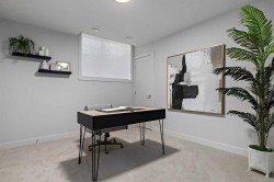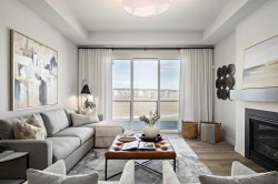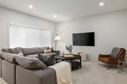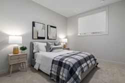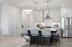 SHOW HOME now available - The Grove at Sage Meadows. This villa is part of an exclusive collection of just 27 homes nestled along the tranquil WEST NOSE CREEK. Combining natural beauty with everyday convenience, The Grove offers immediate access to Stoney Trail and nearby amenities. This show home includes a FINISHED DOUBLE GARAGE, CENTRAL AIR CONDITIONING, CUSTOM WINDOW COVERINGS, a HERRINGBONE TILE BACKSPLASH, and a WOOD MANTLE above the fireplace. Built by Lupi Luxury Homes, this home features luxury vinyl plank flooring, quartz countertops, sleek Zonavita cabinetry, whirlpool stainless steel appliances, designer lighting, custom closet systems, triple-pane windows, and a high-efficiency furnace. The 1,212 SQ. FT. main level offers a well-planned layout with a generous kitchen island with seating for four, an open dining area, a bright great room, and a private primary suite with a double vanity ensuite and walk-in closet. The 995 SQ. FT. WALK-OUT BASEMENT includes two bedrooms, a full bathroom, and a flexible recreation space that opens onto a covered patio. Please note: all RMS measurements are based on builder blueprints. Furniture is not included in the list price but may be purchased at an additional cost.