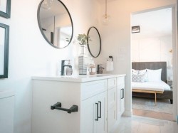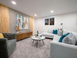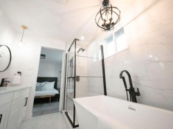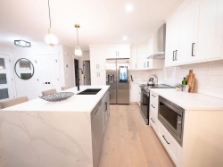 Step into this impressively renovated home, gutted and transformed inside and out approximately two years ago, where a wide open floor plan immediately captivates.The heart of this home is the stunning kitchen, part of the extensive renovation completed around mid-2023, boasting a massive island with a striking waterfall quartz countertop. It's fully equipped with stainless steel appliances, ample storage in a large pantry, and sleek quartz counters throughout.Don't be deceived by the exterior; this home offers surprisingly spacious rooms. The master suite is a true retreat, measuring 14'5"x11'8". It features a luxurious full ensuite, also part of the home's comprehensive renovation, complete with dual sinks, a beautifully tiled glass shower, a separate soaker tub, and a walk-in closet outfitted with custom shelving.The main floor also includes a large second bedroom, another full bathroom, and an inviting open-concept dining and living area. A cozy fireplace and gleaming hardwood floors, all updated during the renovation, enhance the warmth and elegance of this space.Descend to the fully finished basement to discover an expansive family room, perfect for entertaining or relaxing. This level, also fully renovated, houses a stylish laundry room, a full bathroom with a tiled glass shower, and two additional generously sized bedrooms. The layout here offers excellent potential to create an in-law suite or a separate second unit by adding a kitchen, A secondary suite would be subject to approval and permitting by the city/ municipality.The exterior, completely redone roughly two years ago, features durable Hardie siding, concrete walkways, and landscaping. A double detached garage provides ample parking and storage.Investment Opportunity & Versatility: This property has a proven track record as a successful Airbnb rental, boasting excellent ratings, making it a turnkey option for those interested in a short-term rental business. Alternatively, its thoughtful layout easily lends itself to multi-generational living or conversion into two separate units.This exceptional, fully renovated home is a rare find, offering both a beautiful living space and significant income potential. An absolute must-see.