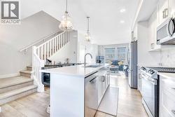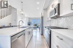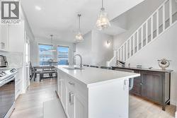 Wolf Willow - 196 Wolf Hollow Park SE: Welcome to this exceptional, air-conditioned 4-bedroom, 4-bathroom townhouse offering over 1,850 sq. ft. of beautifully finished living space in the highly desirable community of Wolf Willow. Showing like new, still under warranty, and with no condo fees, this home stands out as a rare and compelling opportunity.The sun-soaked main floor features luxury vinyl plank flooring and is bright and welcoming, thanks to large south-facing windows that flood the living room and foyer with natural light. The show-stopping kitchen is designed for both everyday living and entertaining, featuring a large central island, stainless steel appliances, soft-close cabinetry, and future-ready gas stove and fridge water rough-ins. A spacious dining area and a sleek 2-piece powder room complete this stylish and functional level.Upstairs, unwind in the inviting primary retreat with partial river views, a private 3-piece ensuite, and a walk-in closet with its own window. Two additional bedrooms, a full 4-piece bathroom, and convenient upper-level laundry with extra storage make this floor as practical as it is comfortable.The fully developed basement expands your living options with a family/recreation room, a fourth bedroom featuring a cozy nook or pocket office, a modern 3-piece bathroom with walk-in shower, and ample storage—perfect for guests, teens, or working from home.Outside, enjoy a landscaped backyard complete with a natural gas BBQ line for easy summer entertaining. A double detached garage with MYQ smartphone control adds everyday convenience, while thoughtful upgrades throughout—including silhouette blinds, soft-touch light switches, and doorbell cameras at the front, rear, and garage—enhance both comfort and security.Ideally located just steps from scenic river pathways, Wolf Willow blends modern living with an unbeatable natural setting. Nestled between the Bow River and Fish Creek Provincial Park, residents enjoy over 100 km of trails, parks, an ice rink, and easy access to schools, shopping, and downtown Calgary.This is a home that truly delivers on style, space, and location. Book your showing today and discover why Wolf Willow living is so special. (id:27)