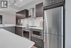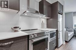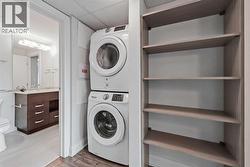 *VISIT MULTIMEDIA LINK FOR FULL DETAILS, INCLUDING IMMERSIVE 3D TOUR & FLOORPLANS!* This bright NORTH-facing 1-bed + den unit with stunning PANORAMIC RIVER VIEWS from the 22nd floor in the upscale Vogue building is a must-see! There are only 4 upgraded floors in the Vogue building, which were specially customized for Bedouin Suites, and this is one of them! EXCLUSIVE BEDOUIN FEATURES include upgraded hallways and common areas, as well as INCREDIBLE UNIT UPGRADES like custom kitchen islands with bar seating, upgraded appliances & lighting including dimmers throughout, custom bedroom panelling including built-in side tables with convenience plugs, upgraded bathrooms with tile wainscoting and glass shower doors, built-in walnut entertainment units, a Smart Sensor energy management system for the eco-minded buyer and MORE! This customized ‘VARSITY’ floorplan also had a kitchen wall removed for improved flow and natural light, and WOW, does it look good! This condo presents modern living at its finest, including an open-concept layout filled with natural light through ample floor-to-ceiling windows, complemented by luxury vinyl plank flooring adorning the main living spaces. The modern kitchen boasts wood-grain cabinets with modern hardware and under-cabinet lighting, a specially designed central island with quartz counters, a tile backsplash, a dual-basin undermount sink, and upgraded stainless steel appliances, including a chimney-style hood fan. The open main living area features a built-in walnut entertainment unit with a wall-mount TV included and access to a large balcony with a gas line for a BBQ and panoramic views of the Bow River. The bedroom features custom wall panelling with built-in side tables, wall sconce lighting and a convenient receptacle with a USB port, plus an included wall-mounted TV. A large walkthrough closet with built-in organizers and a stacked laundry leads to the 4-pc bathroom complete with occupancy-sensored lights, quartz countertops, tile wainscoting, an undermount sink with modern faucet, tile backsplash, modern vanity with storage, tile floors, and a large tub/shower combo with full height tile and an upgraded glass door. Complete with a sizeable den, a perfect home office or flex space, a titled indoor parking stall in the heated parkade and a storage locker. VOGUE is a high-end building with a ton of amenities, including central A/C, an elegant formal lobby, full-time concierge, gym, billiards, a large party room with a kitchen, a yoga studio, a Sky Lounge on the 36th floor, and multiple rooftop terraces. Surrounded by parks, transit, the LRT, shopping & more, & within walking distance to the downtown core & all Kensington shops & services – this location offers the best urban lifestyle in the Downtown Commercial Core. *Please note, the photos and the virtual tour are from the same unit, two floors up. (id:27)