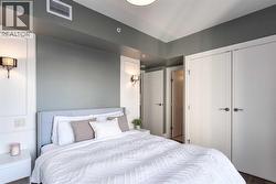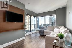 Experience elevated sophistication on the exclusive BEDOUIN Floor at Vogue! One of only four floors in the building with these premium upgrades, this gorgeous corner suite is soaked in natural light and showcasing panoramic views of the city skyline and Rocky Mountains. The BEDOUIN Collection offers refined details including designer lighting with dimmers, custom bedroom paneling with wall sconces, and premium finishes throughout.The open concept kitchen features two-tone cabinetry, quartz counters, under-cabinet lighting, a custom island with bar seating, tile backsplash, and upgraded stainless-steel appliances including a chimney-style hood fan. The chic living space is complete with a book matched built-in walnut entertainment unit. The sizeable corner balcony features a gas BBQ line, making BBQing a dream. The primary bedroom, wrapped in windows, features a spa-inspired ensuite with quartz countertops, tile floors, modern vanity with storage, and a full-height tiled tub/shower combo. The second bedroom offers flexibility as a guest room or home office and is steps from its own full bathroom with a floor-to-ceiling tiled shower and upgraded glass door. The bedrooms are ideally separated for ultimate privacy.Additional highlights include in-suite laundry with new dryer (2025), a titled secure heated underground parking stall with storage, and central A/C. Vogue offers an elegant, hotel-style lobby with full-time concierge plus exceptional amenities: a state-of-the-art fitness centre, yoga studio, billiards and party rooms, and the 36th-floor Sky Lounge with rooftop terraces and breathtaking 360° mountain and city views. Walk to Prince’s Island Park, Kensington Village, the LRT (free zone), boutique shops, fine dining, cafes, and Calgary’s +15 network—all just steps away. This is luxury urban living at its finest. (id:27)