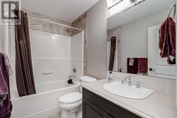 Welcome to 278 Legacy View SE — where showhome-level design meets real life.This is not your average house. This is a former Stepper Homes showhome, meticulously maintained and loaded with premium finishes you simply don’t see anymore. With 3 bedrooms + den, 2.5 bathrooms, and nearly 2,400 sq. ft., this home delivers space, style, and substance — no compromises.From the moment you walk in, the craftsmanship speaks for itself. Professionally designed interiors feature custom valances, designer wallpaper, and detailed hardwood inlay work that elevate the dining and living spaces instantly. 9-foot ceilings and engineered hardwood create an open, upscale flow that feels both polished and welcoming.The kitchen? A statement. Chef-inspired and built to perform, it showcases Ogee bevelled granite countertops, full-height two-tone cabinetry, and a bright walk-through pantry with window. The premium appliance package includes a gas cooktop, built-in oven, French-door refrigerator, and chimney hood fan — perfect for everyday living and serious entertaining alike. The dining area connects seamlessly to the sun-filled living room, anchored by custom millwork and an upgraded electric fireplace with heat blower.Thoughtful upgrades continue throughout the main floor: 8-foot doors, Heritage casings, knockdown ceilings, premium hardware, and a private den with custom glass barn doors — ideal for a home office or flex space.Upstairs, the home truly shines. The west-facing vaulted bonus room delivers height, light, and drama — perfect for movie nights, entertaining, or relaxing after a long day. The primary suite feels like a boutique hotel, complete with a spacious walk-in closet and a spa-inspired 5-piece ensuite featuring Kohler fixtures, dual sinks, a deep soaker tub, a fully tiled shower, and heated tile floors with a dedicated control unit. Two additional bedrooms, a full bath, and an upper-floor laundry room with added cabinetry round out the level.This home represe nts over $100,000 in upgrades, including: Built-in Sonos speaker system, Enhanced plumbing and lighting packages, Full blind package, Custom built-ins in both the office and mudroom, Upgraded baseboards and trim throughoutOutside, the professionally landscaped backyard offers a covered patio for effortless outdoor living. The curb appeal is just as strong, with an exposed aggregate driveway, natural stone accents, and a wrought-iron security door. Add in a 20-panel bi-directional solar system delivering approximately $300/month in electricity savings, plus central air conditioning, and this home checks every box.Located in the heart of Legacy, you’re steps from parks, schools, shopping, and scenic walking paths — a community built for families and long-term living.Meticulously cared for. Completely move-in ready. Former showhome quality without the wait. Homes like this don’t come up often.278 Legacy View SE isn’t just a house — it’s the one. (id:27)