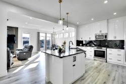 A Rare Opportunity on One of Redstone’s Largest Pie-Shaped Lots! This fully renovated detached home offers over 2,450 SQFT. of thoughtfully designed living space, with a front-attached garage, rear street access, ample street parking, and City-approved commercial parking—ideal for home-based businesses or extra vehicles.Inside, you’re welcomed by a spacious foyer, a custom feature wall, home office, and mudroom. The main kitchen boasts granite countertops, high-end finishes, and opens to a large living room with a gas fireplace and feature wall. A separate spice kitchen with its own pantry adds convenience.Upstairs, enjoy a bright bonus room, a luxurious primary suite with a 5-piece ensuite and custom walk-in closet, plus three additional bedrooms, a full bath with standing shower, and upstairs laundry.The fully finished basement suite (illegal) with separate side entrance includes two generous bedrooms, a modern kitchen with pantry, a full bathroom, and stacked laundry.Set on one of the largest lots in the community with unique dual access and commercial-use potential, this home is truly a rare opportunity in Redstone. Don’t miss your chance to own this exceptional property!