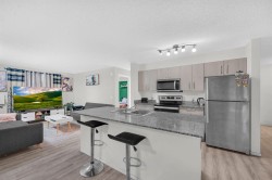 Welcome to this bright, newly renovated 2 Bed, 2 Bath condo with 2 underground parking space in Skyview Ranch, offering over 900 sq ft of modern open-concept living. Freshly painted and featuring brand-new luxury vinyl plank flooring in both bedrooms (no carpet!), this move-in-ready home is perfect for first-time buyers, downsizers, or investors. The stylish kitchen boasts stainless steel appliances, a large island with bar seating, and ample counter space, flowing seamlessly into the living and dining areas. Enjoy your morning coffee on the private covered balcony. The spacious primary bedroom features a walk-through closet and 3-piece ensuite, while the second bedroom and 4-piece bath offer privacy for guests. Added perks include in-suite laundry and two titled underground tandem parking stalls. Close to schools, daycare, parks, shopping, and major routes, this condo offers unbeatable comfort and convenience. Condo fees include heat, water, and professional management. Book your private showing today!