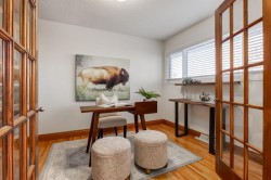 Ideally situated in the quiet, inner-city community of Glendale, this well cared for gem showcases 5 bedrooms, 2 bathrooms, countless upgrades, a single garage, large backyard with mature trees, and a phenomenal location across from a school, steps from the community centre, parks, greenspaces, tobogganing, and outdoor hockey rink. This RC-G zoned, 50x100' lot features a home with charming curb appeal, a separate back entryway (ideal for a future suite), a large font yard and matures trees and front planters. As you enter this beautiful home, you are greeted by solid oak, site-finished hardwood flooring and an open concept layout including a spacious kitchen, bright living room, and a dining room with windows overlooking the beautiful and spacious south backyard. The kitchen boasts a center island with bar seating, tons of counter space, and white solid wood shaker style cabinets with ample storage. The adjacent living room is flooded in natural light through floor to ceiling bay windows and boasts an elegant gas fireplace with marble style surround and a classic white mantle - perfect for cozying up to watch the snow fall outside and to gather around for holidays. Enjoy coffee at your dining room table while watching your kids or pets play in the spacious south-facing backyard. Through double French doors you’ll find the main floor office with beautiful built-in bookcases and shelving, making it the perfect work from home space, or a third bedroom on the main level. The main floor is completed by a full 4-piece bathroom with recent updates. This home boasts a separate back entryway providing access to the lower, giving it the potential to add a legal suite in the future. The lower-level features brand new carpeting, two spacious bedrooms, one with a giant walk-in closet, a large media space, room to play, a large storage area, laundry machines, and a fully renovated 3-piece bathroom with new tile, vanity, and a spacious stand-up shower. Park in the single detached garage and enjoy the summertime in the sprawling south facing backyard with room to play. Other upgrades include central A/C (2021), triple pane windows upstairs (2017), an irrigation system (front and back), a new hot water tank (2024), new sump pump (2025), furnace (2014). Enjoy unobstructed views no neighbors out your windows and the school playground in the distance from your living room windows. This superb location is one block from the Glendale community center which features picturesque scenes, an outdoor rink, tennis courts, a playground, and flows into Turtle Hill Park, which is perfect for enjoying an evening walk in nature. This home is also a quick walk to multiple schooling options including Spanish bilingual, French Immersion, Montessori, Catholic, and public schools, and is a short commute downtown. This wonderful home is extensively upgraded, provides a peaceful inner-city lifestyle in a lower density family friendly community, and affords a great commute to amenities and downtown.