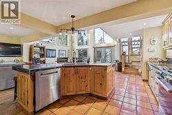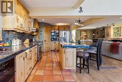 Discover the pinnacle of executive living in this stunning 2,624 sq ft home perched overlooking the serene Varsity Ravine Park. This prime ravine location offers unparalleled tranquility and breathtaking natural views, while being ideally situated on a quiet street in one of Calgary's most sought-after neighborhoods. Step inside to a distinctive floor plan filled with natural light from towering windows adorned with remote-control blinds and custom reflective film—perfect for the west-facing kitchen, dining room, and living room that features a cozy wood-burning fireplace. The heart of the home is the extensively updated kitchen, boasting a large island with a built-in chopping block, gas stove, wine fridge, and newer stainless-steel appliances. Extensive updates include custom built-in cabinetry throughout, enhancing both style and functionality. The upper level welcomes you to a luxurious primary retreat complete with a spacious walk-in closet and a spa-like ensuite featuring a double sink, heated floors, and a no-step walk-in shower with elegant glass block wall. The upper level contains an additional bedroom, and a convenient den overlook the living space below, offering inspiring ravine vistas. The main level provides flexibility with a large recreation room and a bright breakfast nook, ideal for everyday living or entertaining. The lower level features a spacious bedroom with a walk-in closet and built-in storage, plus a 4-piece bathroom. Outdoor living is effortless with a low-maintenance backyard featuring multi-level decks, an outdoor kitchen, and a storage shed backing directly onto the ravine—your private oasis for relaxing and entertaining. The front of the home offers a cozy sitting area and a large driveway leading to an oversized single garage. This exceptional property is perfectly positioned close to the University of Calgary, Market Mall, Foothills Hospital, and just a short walk to the Dalhousie LRT station—combining peaceful ravine seclusion with unbeatable urban convenience. Truly a must see to appreciate the pride of ownership. (id:7525)