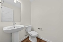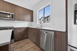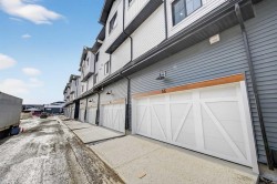 OPEN HOUSE on Saturday, February 14th AND Sunday, February 15th from 12-5pm. Please go to the Show Home located at 96 Creekside Drive SW for access. StreetSide proudly presents this exceptionally popular interior-unit townhome, where expansive living areas meet modern comforts and sophisticated finishes. The thoughtfully designed floorplan features three spacious upper-level bedrooms and two and a half well-appointed bathrooms, complemented by a versatile lower-level den perfect for a home office or quiet retreat. The heart of the home is an inviting open-concept main floor, anchored by a large gourmet kitchen featuring a functional breakfast bar for casual dining. This bright living space transitions seamlessly to a private balcony, offering a perfect setting for outdoor relaxation.The interior showcases high end craftsmanship, including modern dark slab-style cabinetry with a full bank of drawers for maximum storage. The kitchen is further elevated by polished white quartz countertops and a full suite of premium stainless steel appliances. Durable luxury vinyl flooring runs throughout the primary living areas, while the stairs and upper level are finished with plush carpet over an 8lb underlay for superior comfort. Additional conveniences include an attached double car garage, professionally maintained landscaping, and a lifestyle defined by maintenance free living.Life at Sirocco Gate East in Southwest Calgary is about more than just living—it’s about thriving. Imagine having a picturesque central green space at your doorstep, offering opportunities for both tranquil reflection and vibrant community events. Residents enjoy the luxury of sophisticated townhome living with the Rocky Mountains as a backdrop and easy access to both Stoney Trail and Macleod Trail. With daily essentials located in nearby shopping centers, this home offers the perfect blend of scenic serenity and urban convenience.