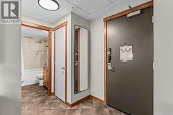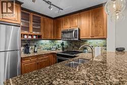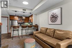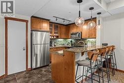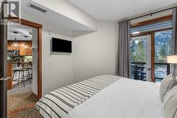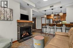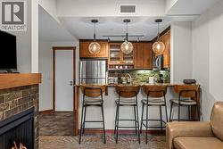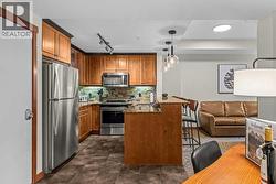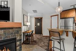 Enjoy the perfect mountain getaway in this beautifully updated suite, offering everything needed for a relaxing vacation. Prepare meals in the fully stocked kitchen, unwind by the cozy fireplace on the pull-out sofa, or take in pool and mountain views from your private patio. The suite features a spacious king bedroom with direct patio access, a full bathroom, and convenient in-suite laundry. Resort-style amenities include a heated outdoor pool, two hot tubs, fitness room, EV charging stations, underground parking with car wash, and a courtyard BBQ area — all designed to make your stay comfortable and memorable. (id:27)