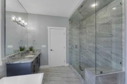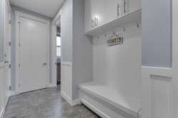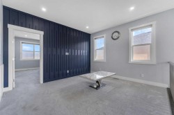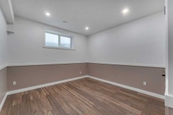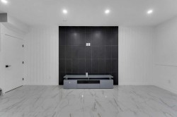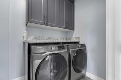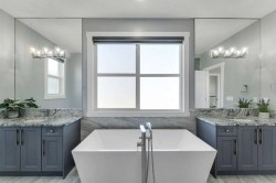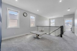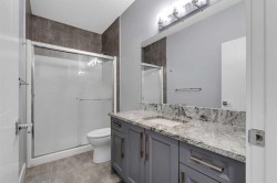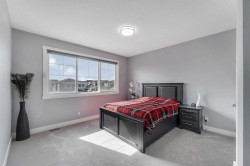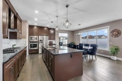 Experience luxury living in this 2700+ sqft custom-built home located in the heart of Chestermere—just steps from the canal, ideal for peaceful walks or bike rides to Calgary for those with an active lifestyle. This west-facing home offers striking curb appeal with an exposed aggregate driveway, vinyl fencing, extended cement walkway, and a maintenance-free backyard patio with BBQ gas line. Step into a grand open-to-below foyer with 8ft doors throughout the main level, paired with 9ft knockdown ceilings, wainscoting, feature walls, and engineered hardwood floors. The main level also features a dedicated flex room, open mudroom with dual coat closets, motorized blinds throughout, and is roughed-in for central vacuum. The chef’s kitchen is a true showstopper, complete with an oversized island, granite countertops throughout, soft-close cabinetry to the ceiling, two gas ranges, two dishwashers, a built-in oven and microwave, high-powered hood fan, and a fully equipped spice kitchen with garburator. The great room showcases a floor-to-ceiling tiled gas fireplace with in-ceiling speakers, creating a perfect space for hosting. Upstairs features 4 spacious bedrooms, including 2 master suites. The primary retreat boasts a spa-like 5-piece ensuite with a standalone tub, custom steam shower, double vanity, ceiling-height mirrors, toilet with window, and a walk-in closet with built-ins. The second master includes its own 4-piece ensuite with stand-up shower. Two additional bedrooms and a full bath with stand-up shower complete the upper level, along with a bonus room with feature wall, laundry room with sink, and Cat5 wiring. The fully finished basement features a separate side entrance, 2 bedrooms, a full bathroom with tiled stand-up shower, laundry and kitchen rough-ins, a storage room, and a large open family room—ideal for extended family or future suite development (subject to approval and permitting by the city/municipality). Additional highlights include a heated, insulated garage with gas line, home security system with 7 cameras + NVR, AC rough-in, and the peace of mind of remaining new home warranty!