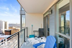 Elevate your downtown lifestyle in this IMMACULATE 11th-FLOOR executive condo with 2 bedrooms + DEN, 2 full baths, 2 TITLED UNDERGROUND parking stalls w/ storage PLUS the rare bonus of only 4 UNITS PER FLOOR for added privacy! This bright CORNER UNIT offers stunning east & north city views through FLOOR-TO-CEILING windows and a large balcony w/ natural gas BBQ hookup, perfect for entertaining above it all. A thoughtfully designed space features hardwood floors, a modern kitchen with granite counters, tons of cabinets, and a versatile den ideal for a home office or dining space. The spacious primary suite includes a WALK-IN closet & spa-inspired 5-PIECE ENSUITE with soaker tub and DOUBLE sinks. Enjoy year-round comfort with a heat pump system (furnace & A/C replaced in 2022) and in-suite laundry. Well-managed building w/ gym and ample visitor parking. Steps to Jasper Ave, restaurants, river valley trails, and everything downtown has to offer, this is urban living done right!