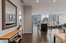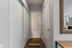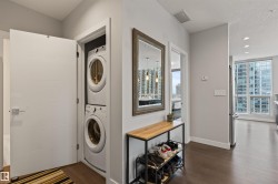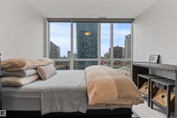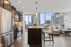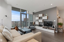 Pristine corner unit with a stunning bright view apartment, boasting large, sunlit windows. This 2 bedroom, 2.5 bathroom gem features southwest exposure, abundant natural light, and floor-to-ceiling windows. The modern finishes and spacious layout just shy of 1000 sq. ft. offer comfort and style. Enjoy a large balcony, underground heated parking with a storage cage, all in an unbeatable downtown location. The two primary bedrooms each have ensuite bathrooms, plus there's an extra half bath, perfect for entertaining—an uncommon feature at this price! The expansive kitchen includes mocha brown cabinets, stainless steel appliances, granite countertops, and a large island with seating. In-suite laundry, luxurious wood flooring in main areas, upgraded tile in the 2.5 baths, and plush carpeting in the bedrooms enhance the living experience. Ultima Tower provides excellent amenities like a gym, showers, hot tub, BBQs, a party lounge, three elevators, and 24/7 security/concierge.