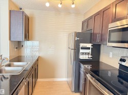 Welcome to this well maintained GROUND FLOOR CORNER UNIT in the sought after community of Crystallina Nera West.This condo offers excellent convenience w/ a private balcony that provides access outside-ideal for pet owners, seniors, or anyone who prefers step-out entry.The functional layout includes a flex space that can be used as home office or personal work area.The unit features 2 bedrooms, including a primary suite w/ 3 piece ensuite & walk-in closet.The 2nd bedroom is well-sized, in-suite laundry that adds valuable convenience & privacy.Additional features; portable A/C & select furniture available for inclusion(excluding living room wall decor & 1 patio box),titled underground parking located directly across the elevator & a storage just in front of the stall.This location is ideal for families & commuters.Proposed K-9 public school is about 10 minute walk, nearby bus stop for quick access to transit.Near shopping centre, parks, walking trails & Henday. Ideal for first-time-buyers or investors.