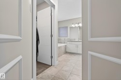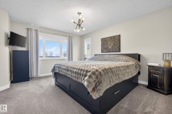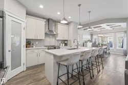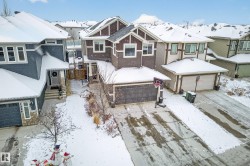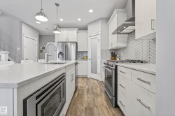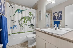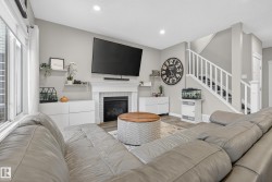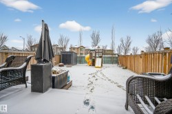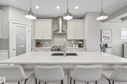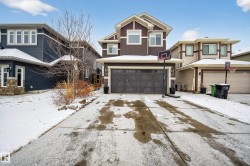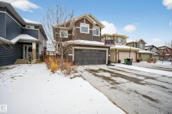 Welcome home to this property with 9-ft ceilings and upgraded flooring throughout the main level. The layout is ideal for daily living, featuring a cozy gas fireplace with mantle. The kitchen shines with quartz countertops, extended island, tile backsplash, upgraded lighting, Frigidaire gas range with stylish Faber hood fan, dishwasher, fridge, and extra dining room cabinetry. Upstairs offers 3 bedrooms plus a bonus room that can easily function as a 4th bedroom or office. The primary retreat includes a walk-in closet and a well-designed ensuite with walkthrough layout, hidden toilet, soaker tub, tiled shower, and upgraded countertop. Convenient upper-level laundry completes the floor. Enjoy the fully fenced backyard with stained deck, privacy walls, garden bed, new shed, and kids’ playset. Energy-efficient features include high-efficiency furnace, HRV, Ecobee thermostat, central A/C, and excellent insulation. The garage includes hot/cold taps, floor drain and fridge water line. Truly move in ready!