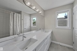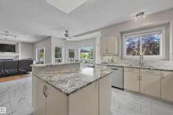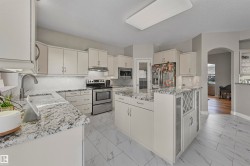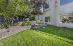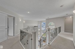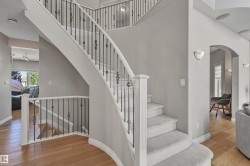 WALKOUT in Terwillegar Gardens w/ 5 BEDROOMS, built by Hillview, cul-de-sac location & close to all amenities. Open concept plan has streams of natural light through the soaring, oversized windows. Enjoy a grand entry w/curved stairs & high ceilings. Neutral contemporary color tones too. MAIN FLR BDRM/DEN w/a FULL BATHRM. Sleek bone white slab cabinets & a huge island. Newer S/S fridge & D/W. Nook opens to the family rm w/wetbar & a massive upper deck w/glass railings. Formal dining & living rm. Upstairs has FIVE LARGE BDRMS. Primary suite boasts a beautiful ensuite, fireplace & W/I closet. F/Fin WALKOUT bsmt includes a Games area, rec rm w/ fireplace & full bthrm. 2 addtl rooms can be completed for a bedrm & exercise area. Massive 8900sf SW pie yard w/mature trees for privacy. Plus huge upper deck. Oversized double garage 22X26. Upgrades: AC (2024), NEW engineered hardwood & tile, NEW granite & quartz counters, 2024 Bathroom updates, new washer/dryer, irrigation system, some blinds updated & more!