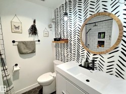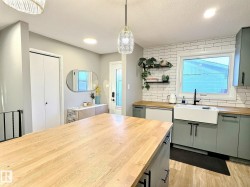 With $100k in upgrades—including a new roof, windows, doors, driveway, hot water tank, full kitchen and bath renovations, and flooring—this beautifully updated bungalow blends modern style with everyday comfort. The bright open-concept design spans over 1200 sq.ft., centered around a stunning kitchen featuring an apron sink, warm butcher block counters, new appliances, subway tile, and a functional island that connects seamlessly to the dining and living areas. Sunlight pours throughout, showcasing polished finishes and a serene neutral palette. Sliding patio doors lead to a spacious backyard, perfect for relaxing or play. Three generous bedrooms and a stylish 3-piece bath offer trendy matte-black fixtures, while the primary bedroom includes a convenient 2-piece ensuite. The partially finished basement provides added potential with room for a fourth bedroom and rough-ins for another 3-piece bath. Located in desirable Thorncliff near schools, parks, Whitemud, West Edmonton Mall, and amenities. A MUST SEE!