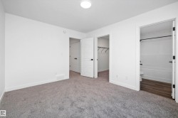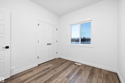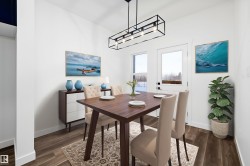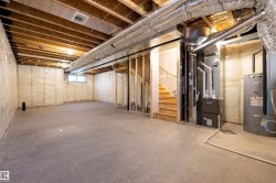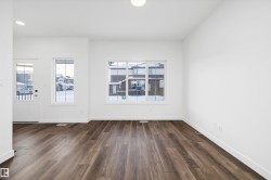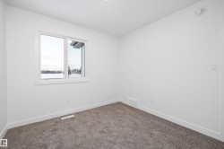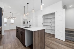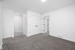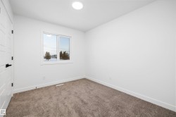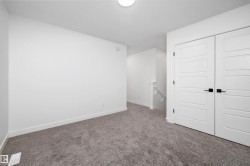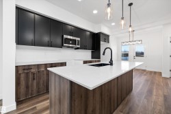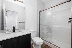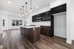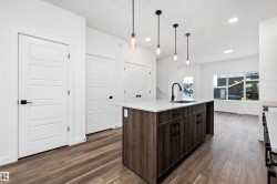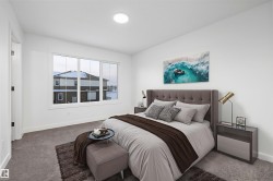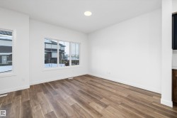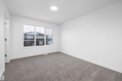 Welcome to the Sylvan by Sterling Homes, a smartly designed home with modern finishes and flexible living space. The main floor offers luxury vinyl plank flooring and 9’ ceilings, starting with a welcoming foyer and coat closet that opens into a bright great room. The kitchen features quartz countertops, an island with flush eating ledge, Silgranit undermount sink, pendant lighting, over-the-range microwave, soft-close upgraded cabinetry, and a pantry near the stairs. At the rear, a sunlit nook overlooks the backyard and sits beside a main-floor bedroom and 3-piece bath with stand-up shower, plus a garden door for outdoor access. Upstairs includes a primary suite with walk-in closet and 3-piece ensuite with tub/shower combo, two additional bedrooms, a full bath, and a laundry closet. 9’ ceilings on main and basement levels, a separate side entrance, black plumbing and lighting fixtures, basement rough-in, and a parking pad with option for a detached double garage complete this home.