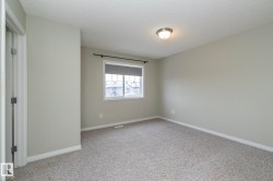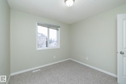 Welcome to the vibrant community of Rutherford. This stylish half duplex offers a fantastic opportunity with NO CONDO FEES and a smart, functional layout. The spacious front foyer provides access to the attached garage, a convenient two-piece bathroom, and a built-in desk ideal for a home office. The open-concept main floor features a bright kitchen with maple cabinetry, modern paint tones, and plenty of windows. A sunny breakfast nook overlooks the backyard and west-facing deck, while the cozy family room is anchored by a gas fireplace. Fresh paint and laminate flooring complete the main level. Upstairs offers three generously sized bedrooms, including a primary suite with a large window, walk-in closet, and private four-piece ensuite. Two additional bedrooms and another four-piece bathroom complete the upper level. The unfinished basement is ready for future development. Close to schools, parks, public transit, and all amenities.