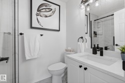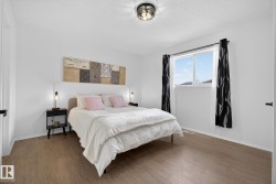 Fully renovated 1747 sq ft bi-level house on a quiet street. 5 bdrms (3 up, 2 down). 3 FULL baths. 1,059 sq ft on main level + 688 sq ft in fully finished lower level. Brand new kitchen, bathrooms, quartz countertops, SS appliances, vinyl plank flooring, hardware & mirrors. All new light fixtures on dimmers. Bright kitchen w/dining area, eat-up island, pantry, soft-close cabinetry, pull-out drawers, low-profile microwave, & pot filler. TWO laundry areas: 1) Full-sized side-by-side washer & dryer in lower level laundry room AND 2) Midea all-in-one washer/dryer off kitchen. NEW soffits, fascia, & eavestroughs. Newer furnace. Newer HWT. Newer central A/C. Shingles 6 yrs old. Vinyl windows. Pie-shaped lot (399 m2 /4,299 sq ft) w/fully fenced yard & new gate. Brand new front concrete walkway & porch. BRAND NEW 17’x20’ double detached garage (w/all permits) & brand new driveway. Walk to Manning Town Centre, LRT & future Costco (going in 1.5 km away replacing 50 St location). Low property taxes: $3,503.04/yr.