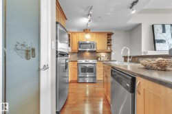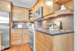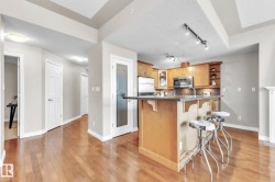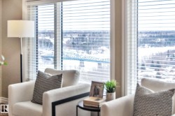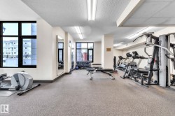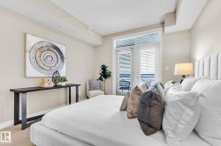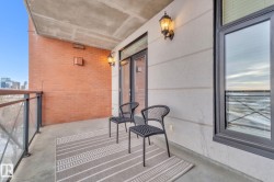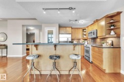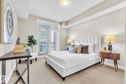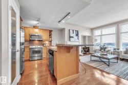 DOWNTOWN EDMONTON CONDO BOASTING SPECTACULAR RIVER VALLEY VIEWS & 2 PARKING STALLS! This 7th-floor, 1,164 sq. ft. condo features 1 bedroom + den, 2 full baths, and 2 side-by-side parking stalls (located on P2, 142 & 176), each with 2 large, lockable storage cages (252 & 253). Features include 9' ceilings, hardwood floors, NEW floor-to-ceiling energy-efficient TRIPLE PAIN WINDOWS, A/C, a gas fireplace, Hunter Douglas blinds, and a LARGE SOUTHEAST covered deck w/gas BBQ hookup that offers unrestricted views of the River Valley! Open kitchen with Maple cabinets and deluxe stainless-steel appliances. The master bedroom has patio doors, a 4-piece ensuite with a separate shower and a soaker tub, and a large walk-in closet. Double French doors lead to the den, which is ideal for an office or bedroom. Building amenities: an exercise room & a gated community. Condo Fees $956 mo. heat+water+electricity. Perfect location for professionals working Downtown, or retirees who enjoy dining, Rogers Place, and the Stadium.