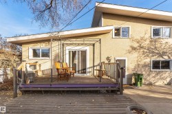 Spacious Elmwood family home! Set on a beautiful tree-lined street, with a broad boulevard and backing onto schools and a large green space, this 1,640sqft split-level home offers bright, open living with vaulted ceilings, large windows and plenty of storage. The main split-level features a sunny living/dining area, an open kitchen with a sliding door to a large deck, plus a bedroom/office, 2pc bath and den. Upstairs are 3 bright bedrooms and a large 4pc bath with double sink and Jacuzzi tub. The finished basement adds a roomy family/flex area, laundry/utility space and abundant crawlspace storage. Enjoy the pleasures of a quiet neighbourhood in your private, landscaped backyard with afternoon and evening sun, and an oversized rear garage. Property updates include furnace, hot water tank, windows and shingles. This home is just steps to transit, shopping, a sports field, playground and rink, as well as both Public and Catholic elementary and junior high schools—perfect for a growing family!