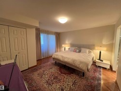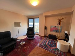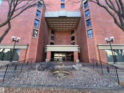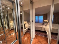 Downtown living at its finest! This stunning 2 bed, 2 bath high rise condo features rich hardwood floors, in-suite laundry, and TWO south-facing balconies — including one off the primary suite. Enjoy breathtaking River Valley views from one of Edmonton’s most iconic buildings the Le Marchand Tower. Titled underground parking.