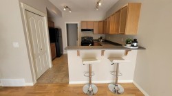 890 sqft main floor condo with detached garage is located in the Village of Crystal Landing. Modern open concept main living area with 9ft ceilings. The kitchen is the perfect size for light entertaining with maple cabinets and a raised eating bar. The laundry and storage room is conveniently located directly off the kitchen. Two great sized bedrooms and one full bathroom. This property also has outside storage, patio with natural gas bbq hook up and a single Wide detached garage . The Village of Crystal Landing is a pet friendly condominium complex.