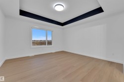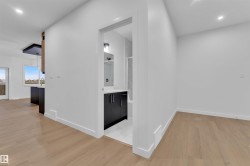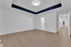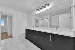 Detached front double car garage home features total of 4 bedrooms, 3 full bathrooms & a bonus room. Comes with appliances & blinds. MAIN FLOOR BEDROOM with FULL WASHROOM featuring a stand-up shower. Main floor luxury vinyl plank flooring. SPICE KITCHEN for added convenience. Main kitchen with centre island, premium cabinetry, quartz countertops, and MDF shelving throughout.The stunning OPEN-TO-ABOVE living area with electric fireplace, and accent wall. Spindle railing leads to Upper level spacious bonus room, primary br with feature wall, indent ceiling, W/I closet & ensuite. 2 more bedrooms with common bathroom & laundry room completed upper level. SIDE BASEMENT ENTRANCE. Additionally, the property offers 9-FT CEILINGS ON Main & basement LEVELS. Located beside a school, minutes from COSTCO, the EDMONTON OUTLET MALL, and the AIRPORT, you get quick access to all amenities.