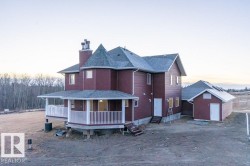 Welcome to this 2886sq ft modern Victorian 2 storey built in 2007 on 6.23 rolling ACRES offers 4,266sq ft of total living space, 4+1 bedrooms, 4 bathrooms, POOL HOUSE, GEOTHERMAL heating/cooling and DOUBLE GARAGE. The wrap around deck greets you as you enter the foyer. The large L/R with W/B fireplace, large island kitchen with S/S Appliances, W/I pantry, breakfast nook and extra-large formal dining for entertaining, office/den, 3pc bath with garage access. Upstairs you will find a private primary suite with sitting area, W/B fireplace, 4pc bath, soaker tub, W/I closet, laundry room, 4pc bath and 3 additional spacious bedrooms. In the well-lit basement has in-floor heating, there is a bedroom, rec room and wet bar perfect for game night, W/B wood stove, theater room and 2pc bath. Property is fully page fenced and prepped for future 40X80’ shop. PAVED roads to driveway. Located just a few minutes to RIDGE VALLEY K-6 SCHOOL . Perfect for a home-based business.