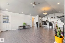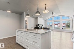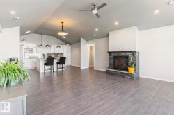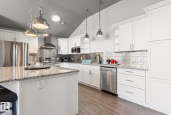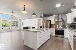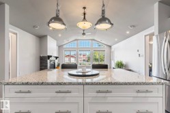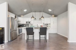 This stunning 2017-built bungalow in Val Quentin combines modern elegance with lakeside charm, offering 2 spacious bedrooms, 2 bathrooms, and a garden suite with its own washroom above the oversized double garage. Set on a large, beautifully landscaped lot with lake views and RV parking, the home features an immaculate open-concept design with vaulted ceilings and massive windows that fill the living, dining, and kitchen spaces with natural light. The kitchen impresses with granite countertops, a large island, stainless steel appliances, and a custom industrial steel backsplash with matching lighting. With its pristine condition, versatile garden suite, RV space, and serene setting, this property is truly a rare find.