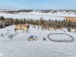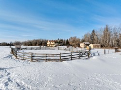 LOCATION, LOCATION, LOCATION! Only 5 km East of Leduc on Hwy 623, sits this unique 47.86 acre country residential oasis. Gorgeous 1526 sq ft bilevel, reverse walkout with oversized attached garage. Main living quarters upstairs, with a beautiful kitchen, boasting knotty pine cabinets, large island, bay window, and attached screened sunroom. Huge dining area with plenty of room for the Sunday family dinners. Picture window provides beautiful view of the treed area at the back. Bright living and formal dining room with vaulted ceiling, skylight and large natural light flow throughout. Two bedrooms with a 3 pce ensuite in the primary, complete the main floor. Lower level is completely finished with 2 additional bedrooms, recreation area, 4 pce bath, laundry and utility room. In-floor heating on this level, as well as access to the garage. 20 acres of pasture, fenced for horses, with accompanying sheds and corral. Beautiful yard with variety of manicured gardens. Unique property; a must see!