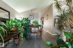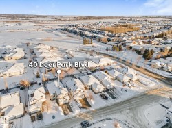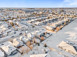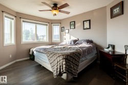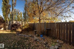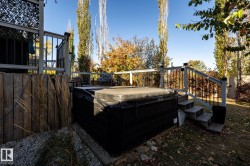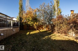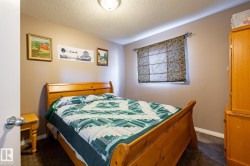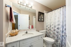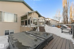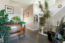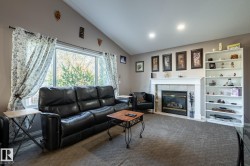 Welcome to Deer Park, a desirable west-side Spruce Grove community offering quick access to HWY 16. This inviting, air-conditioned modified bi-level built in 2000 offers over 2500 sq ft of living space & a heated, 18'Wx21'L double attached garage. Main floor: vaulted living room, kitchen & dining area, cozy family room w/ gas fireplace, two bedrooms & 4-pc bath. The private primary suite above the garage includes a walk-in closet & 3-pc ensuite. The basement is super bright featuring a spacious recreation room, updated 3-pc bath, 4th bedroom, storage room, laundry room & flexible den that could easily become the 5th bedroom or hobby room. Updates: shingles, furnace, hot water tank, engineered hardwood, vinyl plank flooring, carpet, quartz countertops in kitchen, custom built 8ft island, updated kitchen cabinetry, blinds, electric stove, and dishwasher. Enjoy patio door access to the two-tiered deck w/ hot tub & private fenced yard with mature trees/landscaping. Move in ready!