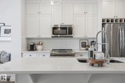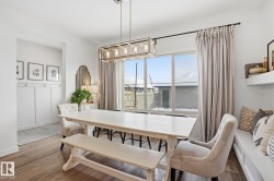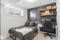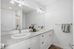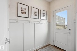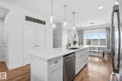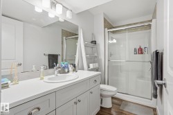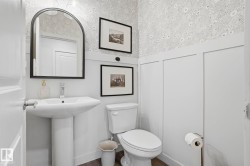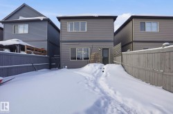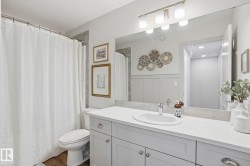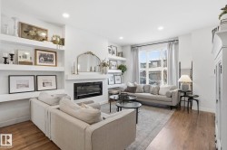 Welcome to this thoughtfully designed 4 bedroom home in the sought-after community of Greenbury, ideally located close to walking trails & schools. Built on SanRufo’s Emily floor plan, the main level offers 9’ ceilings, vinyl plank flooring, cozy living room w/electric fireplace & features upgraded lighting. Contemporary kitchen features floor-to-ceiling cabinetry, quartz counters, large pantry & custom wainscoting. The west-facing front window floods the home with natural light. Mud room provides access to the fully fenced back yard. Upper level features 3 bedrooms, has no carpet, includes the convenience of laundry room; primary bedroom includes walk-in closet w/built-in shelving & 4-pc ensuite complete w/double sinks & tile shower. Fully finished basement includes large family room, 4th bdrm & 3pce bath. Additional features include triple pane windows, stone front exterior, exposed aggregate stairway case & double garage w/back alley access.