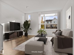 Welcome to this nearly NEW townhome in the beautiful Jensen Lakes community of St. Albert! Enjoy MAINTENANCE-FREE living just steps from the BEACH, parks, trails, dining, and theatre. This STYLISH home offers an open-concept layout with 2 bedrooms and 2.5 modern bathrooms. NATURAL LIGHT pours in through large windows, creating a warm, welcoming space for entertaining or relaxing. The SLEEK kitchen features white cabinetry, quartz countertops with a breakfast bar, and stainless-steel appliances. It flows seamlessly into the SPACIOUS living and dining areas and opens to a CHARMING upper deck. Upstairs, you'll find 2 PRIMARY SUITES—each with its own ensuite and closet—plus a convenient laundry area. The ground level includes a MASSIVE tandem garage, utility space, and access to a fenced yard and green space. Whether you're starting out or downsizing, this home is move-in ready, low maintenance, and ideally located—it truly rates a perfect 10/10!