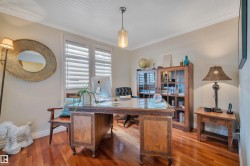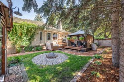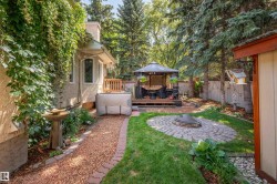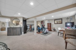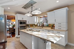 Nestled onto the desirable street of Berrymore Drive, discover this custom built ORIGINAL OWNER EXECUTIVE BUNGALOW. An impressive front courtyard welcomes guests w/ beautiful landscaping & morning sun exposure. The foyer has newer oversized tiles & opens into SOARING VAULTED CEILINGS. The dining room has a coffered ceiling w/ beams & Canadian cherry HARDWOOD FLOORING. The renovated kitchen has white cabinetry w/ some warm toned wood features, QUARTZ counters, gas cooktop w/ a built in fan, pantry, eating bar island, pot lighting, under cabinet lighting, wine bar & the fridge was replaced in 2025. There is a dining nook w/access out to the extremely PRIVATE BACK DECK. The great room has a 3 sided gas f/p. There are 2 main floor bedrooms, 4pce bath, a 4pce ensuite w/ a HEATED FLOOR, & laundry room. The FULLY FINISHED BASEMENT has a spacious 3rd bedroom, 4pce bath & a huge rec room. There is a double attached heated garage (19'1" x 22'4") & RV PARKING. This beautiful home is full of charachter & has it all!