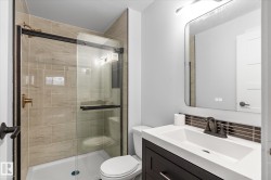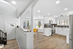 Beautifully renovated 4-bed, 3-bath home offering modern style and functionality. The main floor features 3 bedrooms, 2 bathrooms, an open-concept living area with elegant archways, newer flooring, and a marble-tiled fireplace. Enjoy the indoor hot tub for year-round relaxation. The bright kitchen boasts white cabinetry, quartz countertops, black backsplash, and stainless steel appliances. Upstairs offers a private bedroom, full bath, fireplace and large balcony. The basement, with side entrance, includes a full kitchen and private laundry.