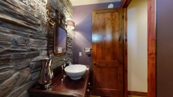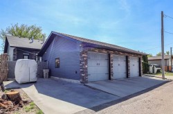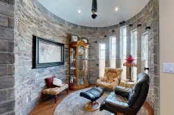 This stunning, custom designed home is a masterpiece of architecture and craftsmanship. Carefully and meticulously built by a master craftsman, every corner of this home has been developed for the ultimate living experience. Inside, the floors are rich hardwood and there are a number of curved walls done in Country Ledgestone. To the right is a curved den which has a vision art TV and unique custom windows. The heart of this home is the gourmet kitchen, featuring solid alder cabinets, granite countertops, a double oven, and a stone arch encompassing the cooktop. The Solas Heat & Glo fireplace beside the dining room table is a standout feature. Adjacent to the dining room, a curved stone wall creates an office with custom-made curved cabinets. The living room is spacious and inviting, with a gas fireplace, a large screen TV for entertainment, and garden door access to the back deck. The primary bedroom is a generous size, adorned with elegant wallpaper, crystal chandeliers, and an adjoining ensuite. This bathroom features a clawfoot tub, opulent granite shower and countertops, heated tile floor, and a heated towel bar. This bathroom can also be accessed via the back entrance, which also houses the washer and dryer. There is a 2-pc bathroom which is accented with a stone wall. Heading downstairs, there is another curved stone wall leading the way to the media room. Down the hall, there are 2 more bedrooms, one is oversized with 3 built in twin beds and 2 closets. There is a large storage room and utility room with a boiler. Modern amenities include 6 TVs with their own receivers (2 are 3D), 7 pairs of 3D glasses, 8’ knotty alder doors on main floor (7’ downstairs), wide trim and baseboards, transoms above exterior doors, and LED pot lights. The home was well constructed with an ICF foundation and triple pane windows. The front facade of this home is beautifully done in stone and the yard is low maintenance with grass, attractive shrub beds, and exposed aggregate sidewalk. In the back, there is a detached, 3 car garage with underfloor heat and a full wall of cabinets. The area between the house and garage is completely fenced. This home is just a short walk to main street shopping and to the schools, making it suitable for families in any stage of life.