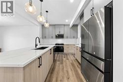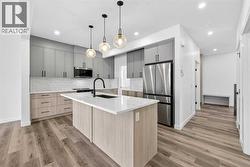 Experience refined living in this exceptional walkout two-storey luxury residence by Dhaduk Homes, perfectly positioned on a prestigious corner lot in a quiet, family-oriented enclave backing onto a serene pond and expansive green space. The west-facing exposure fills the home with golden natural light while offering tranquil views and breathtaking sunsets. An oversized triple-car garage provides ample room for luxury vehicles and additional storage. The open-concept main floor is thoughtfully curated for upscale living and entertaining, anchored by a chef-inspired gourmet kitchen with premium appliances, extensive custom cabinetry, and a striking statement island. The space flows effortlessly into the dining area and an elegant living room highlighted by a sleek electric fireplace, creating an inviting yet sophisticated setting. A main-floor bedroom offers exceptional flexibility, ideal for guests, a private office, or refined multigenerational living. Upstairs, the lavish primary retreat serves as a private sanctuary, featuring a spa-like 5-piece ensuite, a generous walk-in closet, and calming views of the pond and green space. Two additional bedrooms share a beautifully appointed full bath, while the upper-level family lounge provides an elevated space for entertaining, movie nights, or relaxed evenings. Additional highlights include a full walkout basement awaiting your bespoke design, a 200-amp upgraded electrical panel, and soaring 9’ ceilings on both the main floor and basement levels. Backing onto nature and meticulously crafted with timeless elegance, this remarkable home delivers a rare blend of luxury, privacy, and lifestyle for the most discerning buyer. (id:27)
