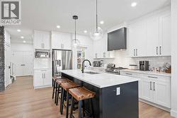 This beautifully designed two-storey home delivers the perfect mix of contemporary style and everyday practicality. The open-concept main level is bright and welcoming, anchored by a crisp white kitchen with quartz countertops, streamlined cabinetry, and a large island that’s perfect for casual dining or entertaining. The adjoining eating nook seamlessly connects to the cozy living area, highlighted by a sleek electric fireplace. A versatile main floor flex room offers endless possibilities — ideal as a home office, formal dining space, or playroom. Upstairs, you’ll find four generously sized bedrooms, including a spacious primary retreat featuring a walk-in closet and a spa-inspired 5-piece ensuite. A central bonus room creates the perfect hangout for movie nights or quiet relaxation, while the upper-level laundry room with sink adds everyday convenience. The fully developed basement offers even more flexibility with a separate entrance and an illegal suite complete with its own kitchen, bedroom, 3-piece bath, laundry, and large recreation area — ideal for extended family, guests, or a home-based business setup. Outside, the sunny backyard is ready for summer enjoyment with a deck and swimming pool — and the pool can remain for the new owners to enjoy. With its thoughtful layout, income potential, and modern finishes throughout, this home offers exceptional value and versatility. (id:27)