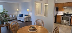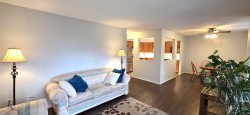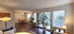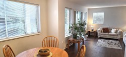 Beautifully updated, immaculately maintained, 2-bed, 1-bath open-concept CORNER UNIT. Located on the 1ST floor, but elevated above ground level, offering an ideal blend of convenience, privacy, and security, surrounded by lush trees and shrubs that provide natural sound dampening. The spacious kitchen is a rare find featuring S/S appliances, new countertops, stylish backsplash, refinished cabinets, updated sink & fixtures, and room for an eating area. The living room and dining room are flooded with natural light through a nearly full wall of windows and sliding glass door opening to a private balcony. IN SUITE LAUNDRY, abundant storage, and additional storage locker on the same floor. 1 secure underground parking (+ optional rental). Centrally located. This condo checks every box!