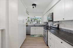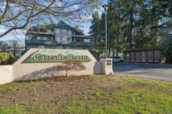 Welcome to this bright ground floor corner unit. Step inside to a thoughtfully designed layout offering great privacy, with bedrooms located on opposite sides of the home. Fresh paint throughout and new laminate flooring create a warm, welcoming feel. The open living and dining area features a cozy upgraded gas fireplace and large windows that fill the space with natural light. The kitchen offers white cabinetry, stainless steel appliances, generous counter space, and a window over the sink. The primary bedroom includes a walk through closet and private ensuite, while the second bedroom is nicely separated beside the second full bathroom. A spacious in suite laundry and storage room adds everyday convenience. Tucked into a peaceful, tree lined community with everything you need close by.