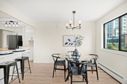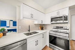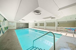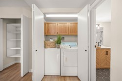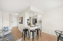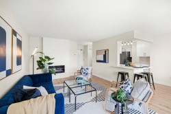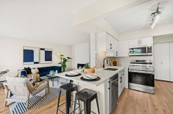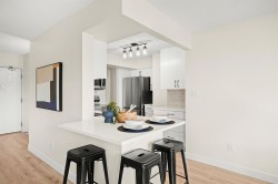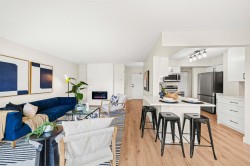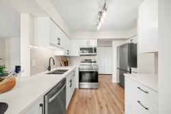 Renovation! Renovation! Renovation! This 2 bed, 2 bath unit is in Evergreen Village—one of Abbotsford’s best managed 55+ communities. Concrete construction makes this home quiet and solid! Enjoy a spacious open-concept layout with a deluxe chef’s kitchen, quartz counters, custom cabinetry, new stainless appliances, laminate flooring, A/C, and spa-like baths. Includes in-suite laundry and a versatile office/storage room. The building offers top-tier amenities: indoor pool, hot tub, workshop, library, hobby/recreation rooms, RV parking, guest suit and secured underground parking. Prime location with a bus stop out front and all essentials nearby. Call Today!