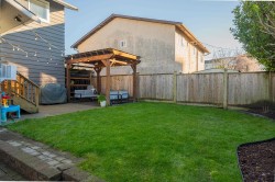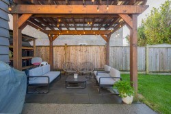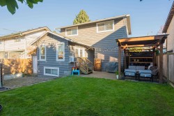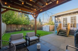 Beautifully updated home with a private-entry 1-bedroom suite on a quiet dead-end cul-de-sac. Bright, open kitchen/eating area offers a breakfast bar with quartz counters, ceramic tile backsplash, under-cabinet lighting, and French doors to a private backyard. Family room features large windows, cozy gas fireplace, vaulted ceiling with white-washed shiplap, and designer lighting. Updates include wide plank laminate floors, fresh designer paint, new lighting, and vinyl windows. Upstairs: 3 bedrooms, including a primary with his & hers closets and its own balcony. Fully fenced, manicured yard with a covered outdoor living space, firepit, and paving stone patio. Close to Terry Fox Elementary, parks, and historic downtown Abbotsford.