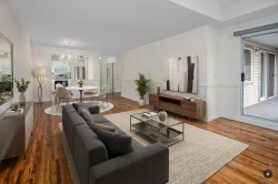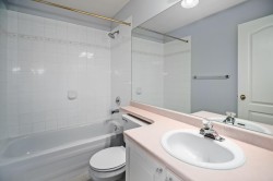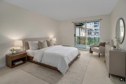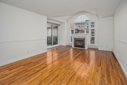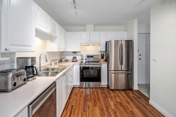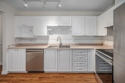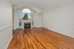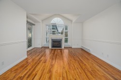 WELCOME TO BRAMBLEWOODS BY THE STREAM. This spectacular 4th-floor penthouse is located on the quiet, north-facing side of the building, offering a cooler comfort during warm summer nights. The bright and spacious condo features vaulted ceilings, large windows, and cozy gas fireplace in the generous living room, complemented by a well-sized dining area. The kitchen offers white shaker cabinets and stainless-steel appliances. This home includes 2 bedrooms, with a spacious primary bedroom featuring a built-in wardrobe. Patio doors open from both the living room and primary bedroom, extending your living space outdoors. Enjoy walking-distance access to parks, trails, & shopping. This well-maintained 55+ building allows 1 small dog or cat. Don't miss this opportunity - Home Virtually staged.