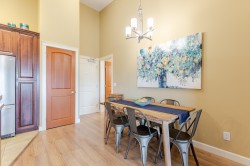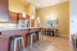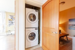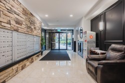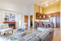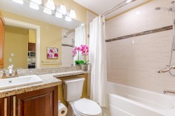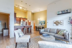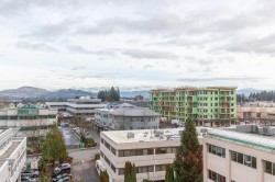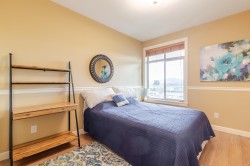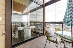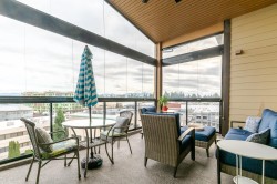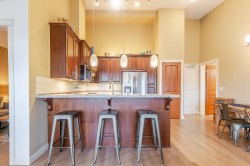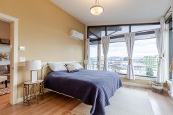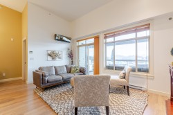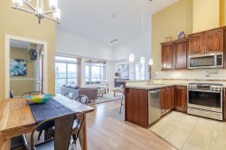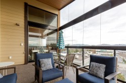 Welcome to the La Galleria! This top floor, corner unit provides stunning panoramic views of the mountains & the city. There are 2 beds, 2 baths & a den in 1300 sqft including a 197 sqft solarium that can be opened up to allow fresh air in or when closed it provides extra living space all year. The high vaulted ceilings & numerous windows provide a bright & spacious living space. The granite counter tops, S/S appliances including a gas stove & an abundance of cabinets make this kitchen ideal for all your cooking & entertainment needs. There are many extra features including heated floors in the bathroom, A/C, in-suite laundry & an enclosed space for your Gas BBQ. Two parking spots, a storage locker & open court yard add to the convenience & enjoyment of this centrally located complex