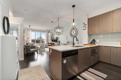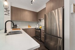 Here it is! Top floor unit with amazing views at the Veritas by Polygon. Stunning open concept living in this 2 bedroom, 1 bath home. Bright and airy with vaulted ceilings make the space look bigger than it is! Step through your front door to a great sized kitchen and living space. QUARTZ counters, LAMINATE floors and STAINLESS appliances top this incredible condo off! Buy as an investment or live in today! STEPS to all major amenities, shopping, trails and SFU! Best priced 2 bedroom on the mountain! Call today as this one won't last long! Open House Saturday Feb 7, 2026 - 2:00-3:30pm